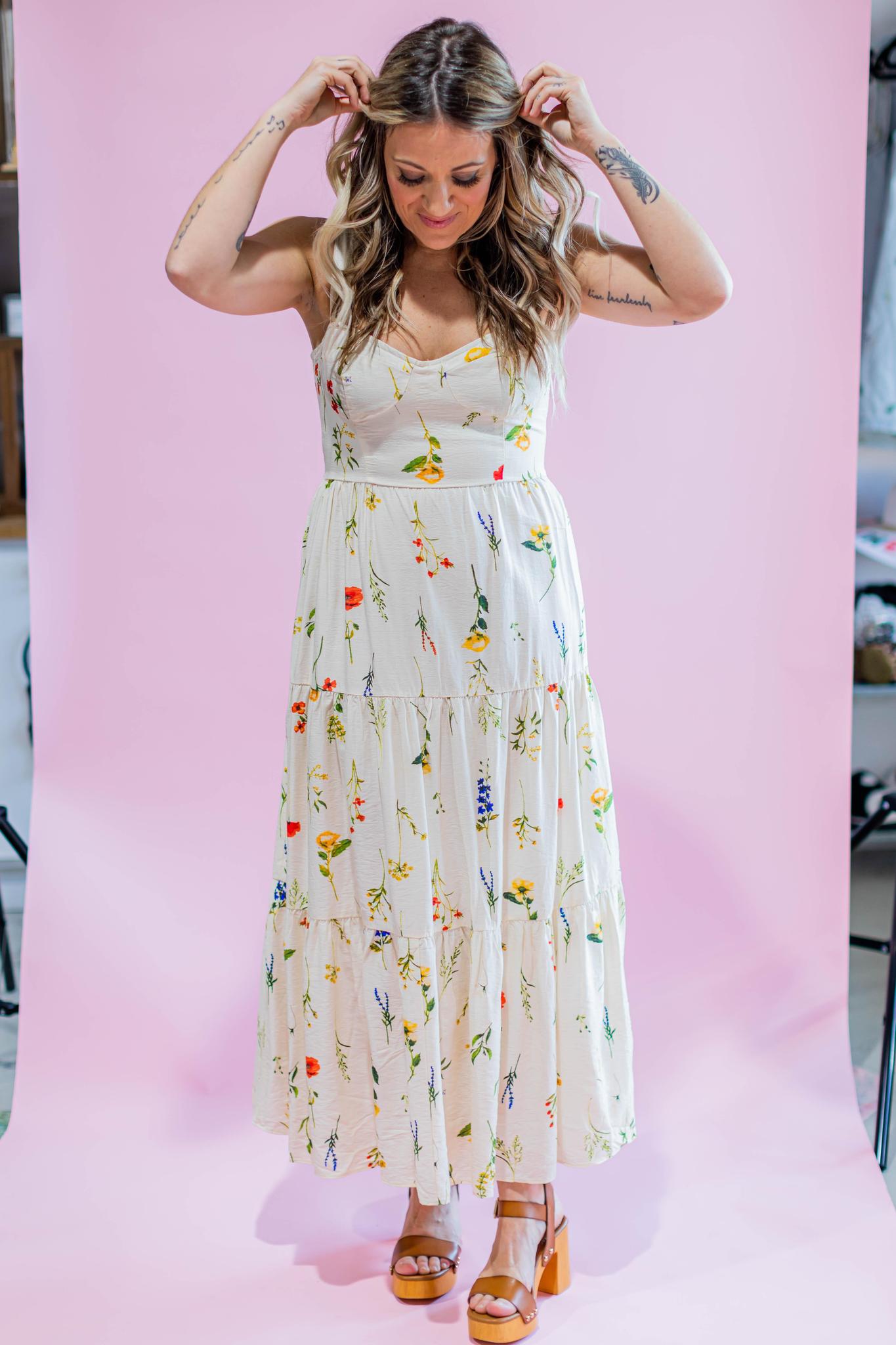 A stunning spring maxi, with a sweetheart corset style top, wide straps, a zippered side and flowy body. This cream and floral print is perfect for spring and summer. Pair with a denim jacket until the weather warms up.