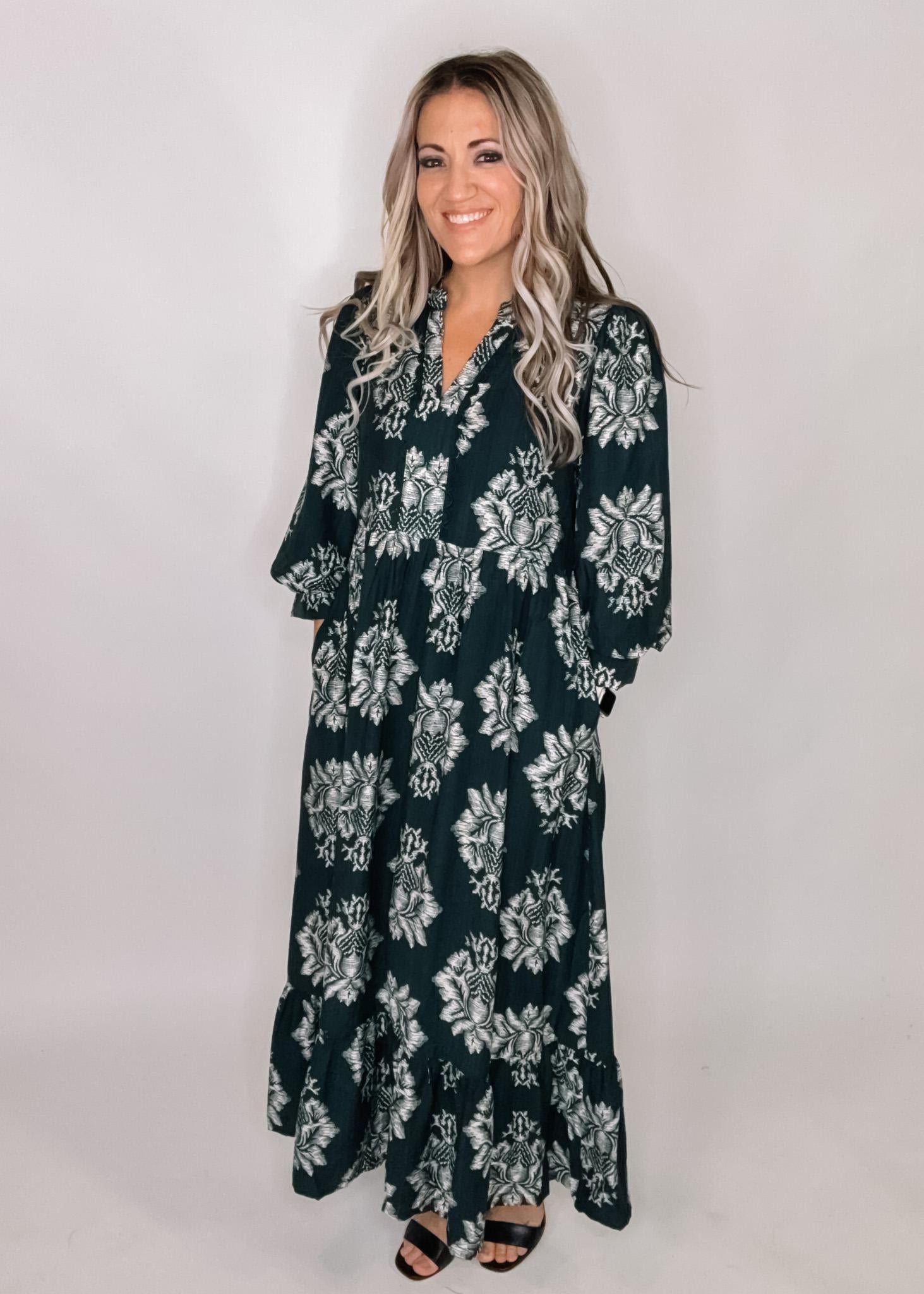 A navy and white damask style maxi dress, gorgeous for any time of year. A classic v neck, maxi length, and subtle peasant sleeve, this dress is timeless and easy to wear for work or play.