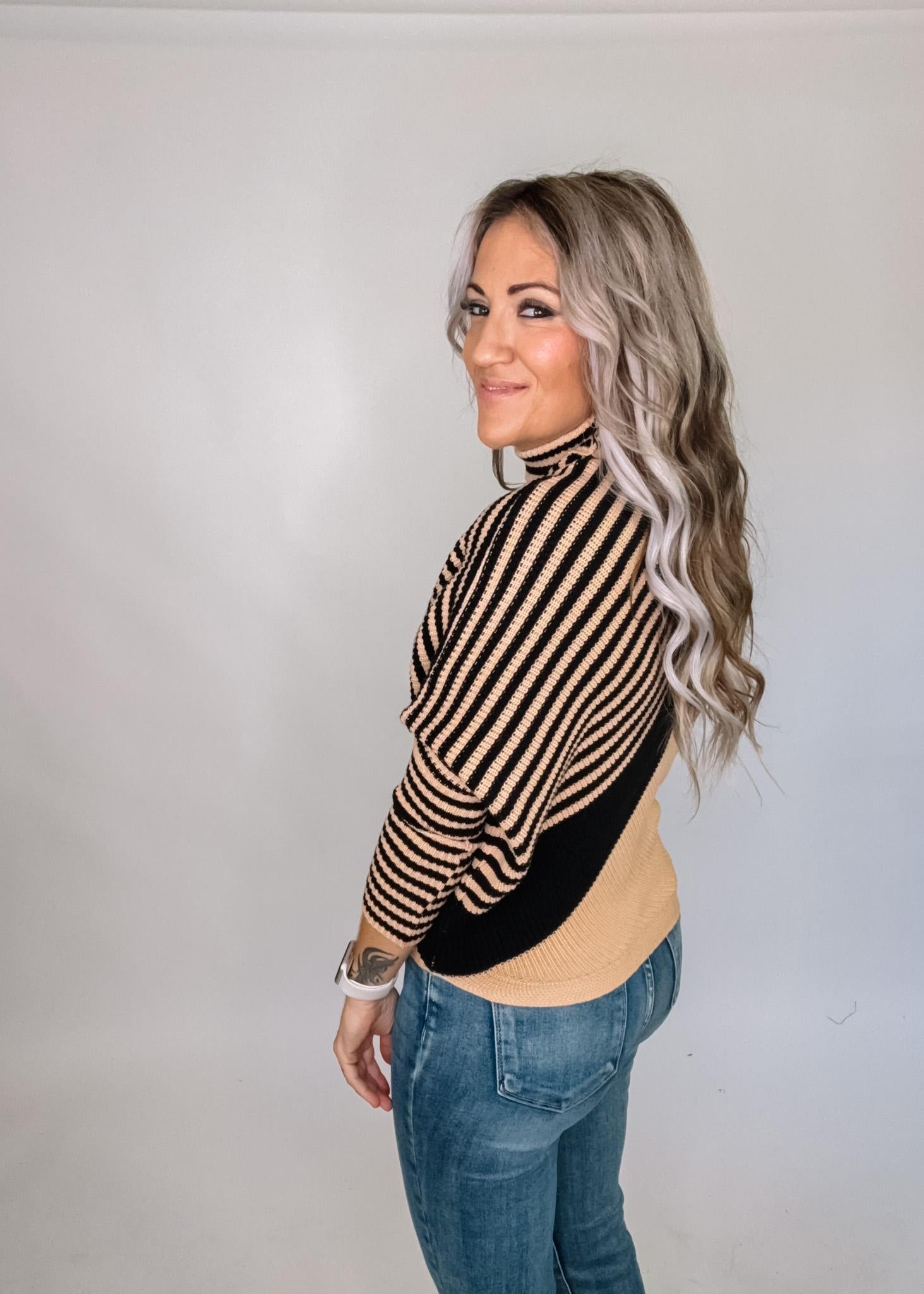 A unique turtle neck dolman style top with diagonal stripe detail, in a taupe and black color scheme. This is such a cool top, and perfect for fall, winter, and early spring styling. Fitted in the arms and body, if you are in between sizes, size up.