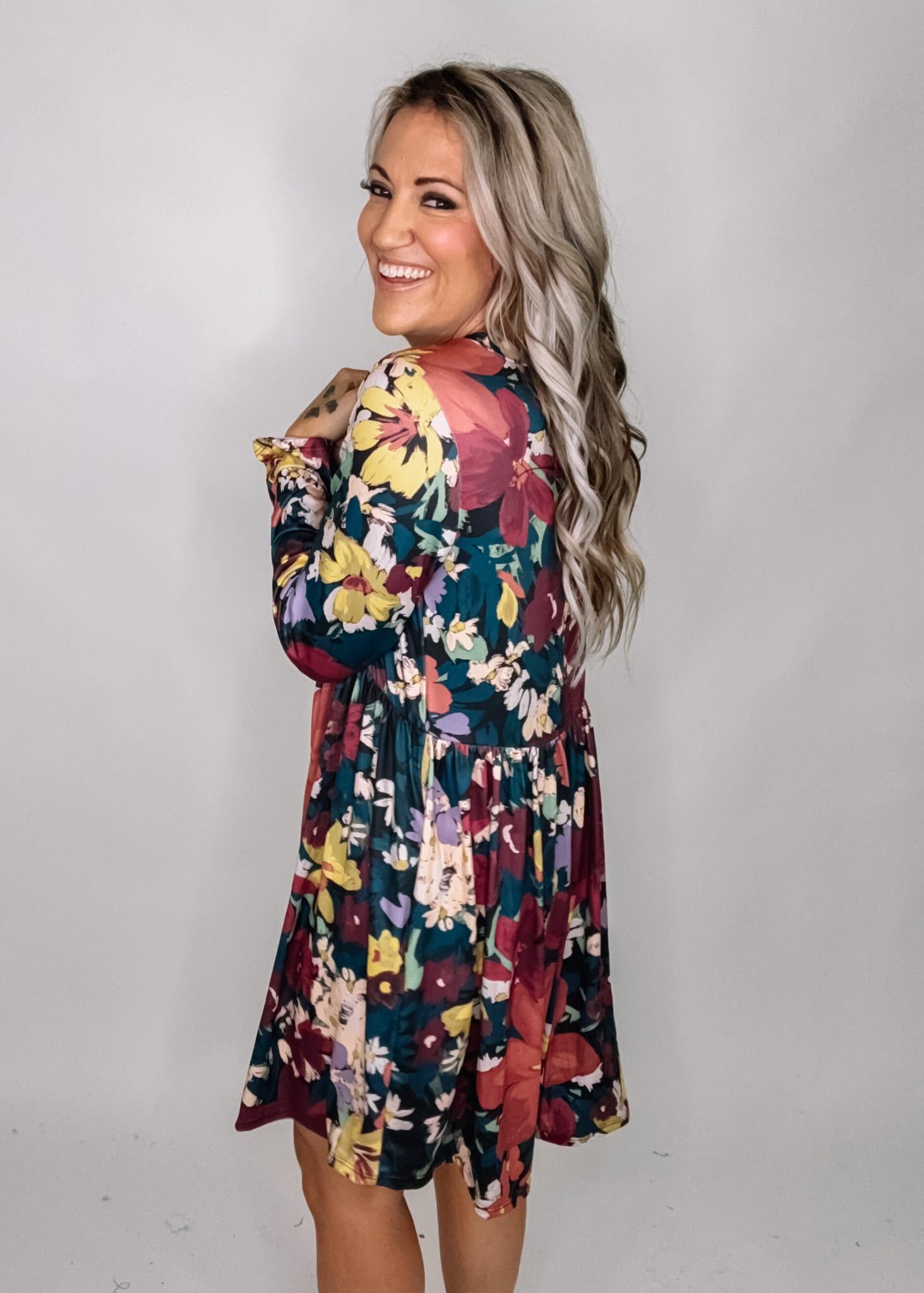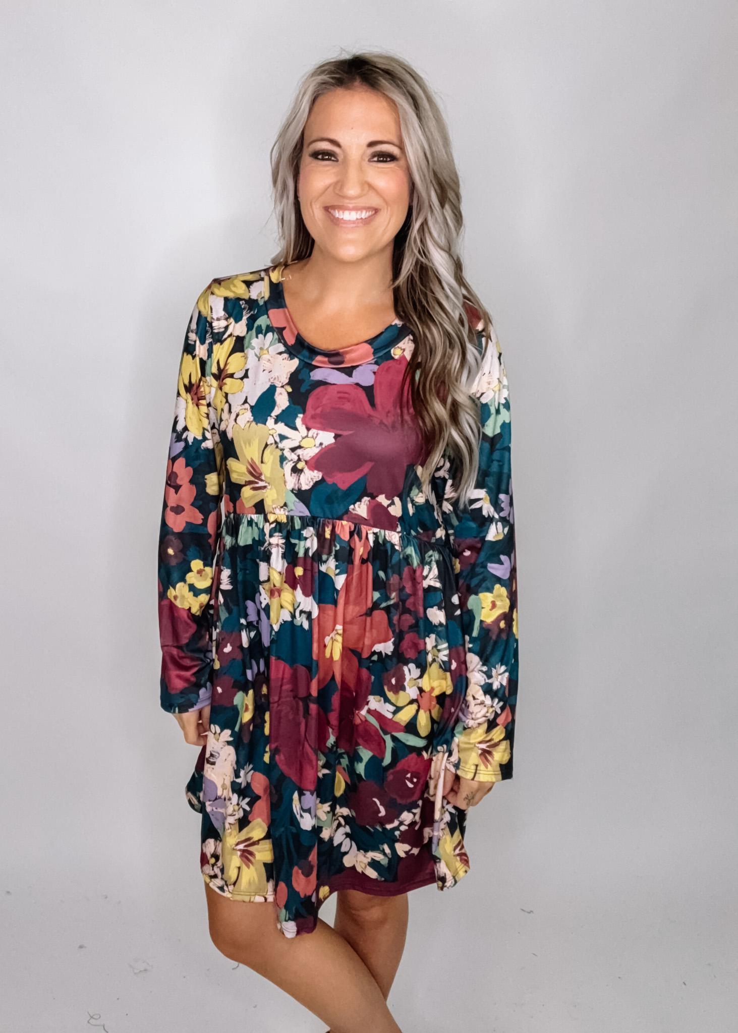 A super soft buttery material, similar to leggings, in this gorgeous floral print. Scoop neck, long sleeve, babydoll cut and relaxed fit. An easy throw and go for year round wear.
