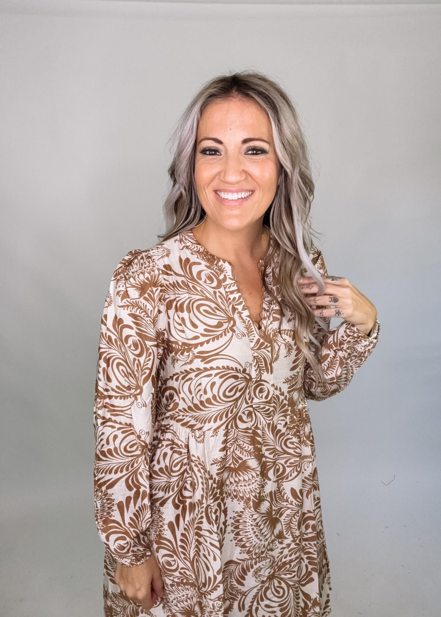 The perfect little mini dress for fall, with this caramel floral color scheme, and a classic babydoll body this dress is an easy wear for work or weekend. if you are in between sizes, size up.