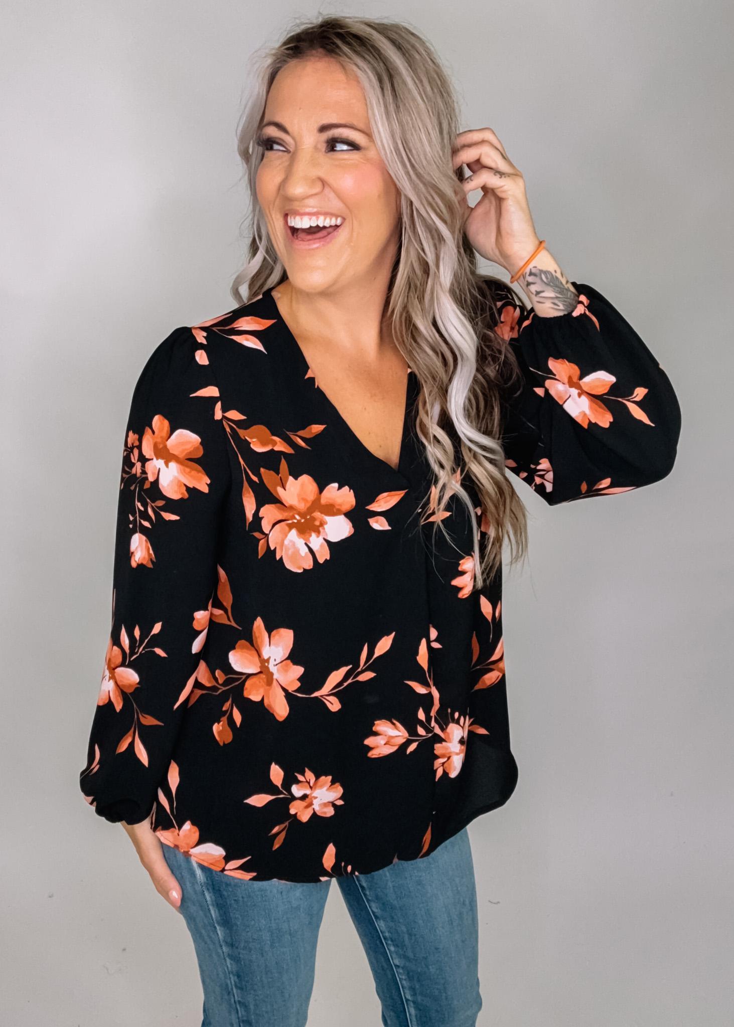 A gorgeous v neck style blouse with elastic in the cuff, relaxed fit in the body and the sleeve. This is a gorgeous floral print, black in the body and pink florals. Perfect for year round wear, work or weekend.