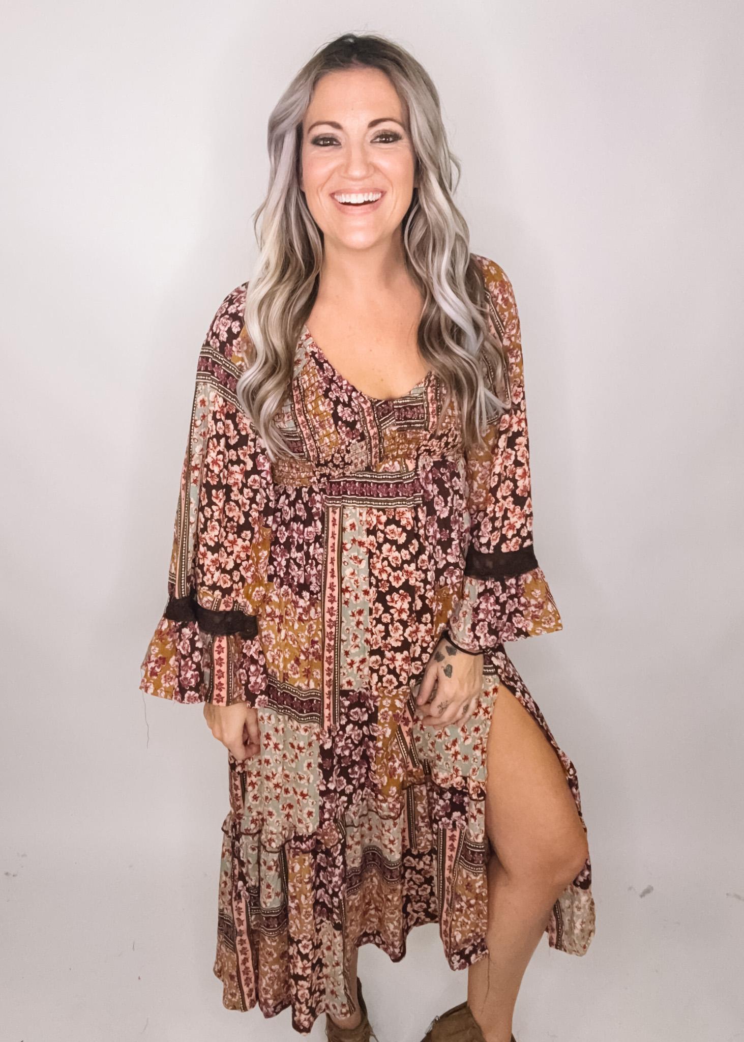 A gorgeous boho maxi sleeve dress with a fun patchwork printed pattern, perfect for fall and spring wear. Smocked in the bust area for added stretch, 3/4 length bell sleeves with lace trim detail, and a high side slit for a little leg. This dress is beautiful.