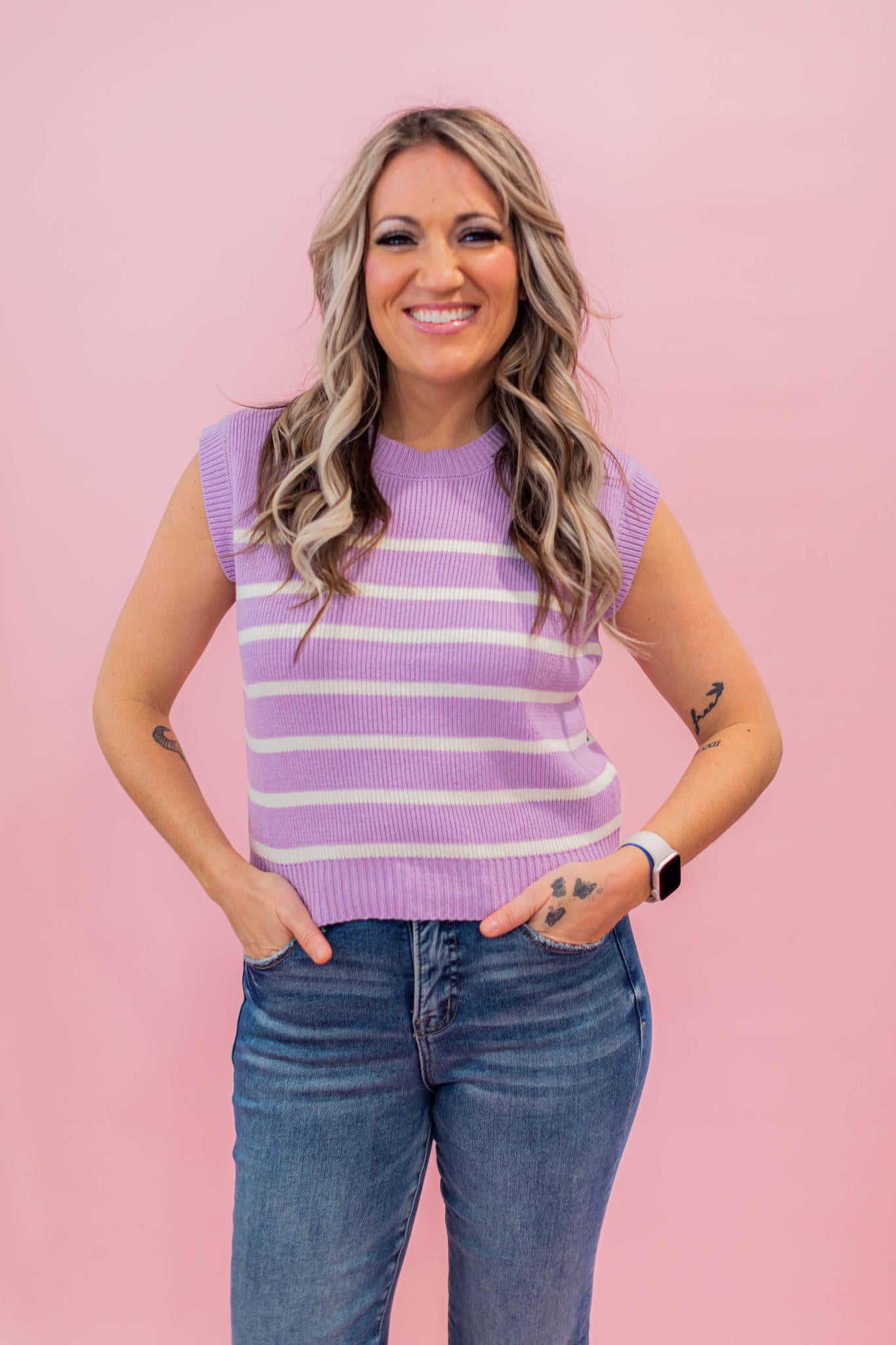 A sleeveless style knit sweater top with a ribbed collar neck line that matches a thicker banded bottom hem line and cap sleeve detail. Lilac in color this is a soft, and popular, color to wear into the spring season.