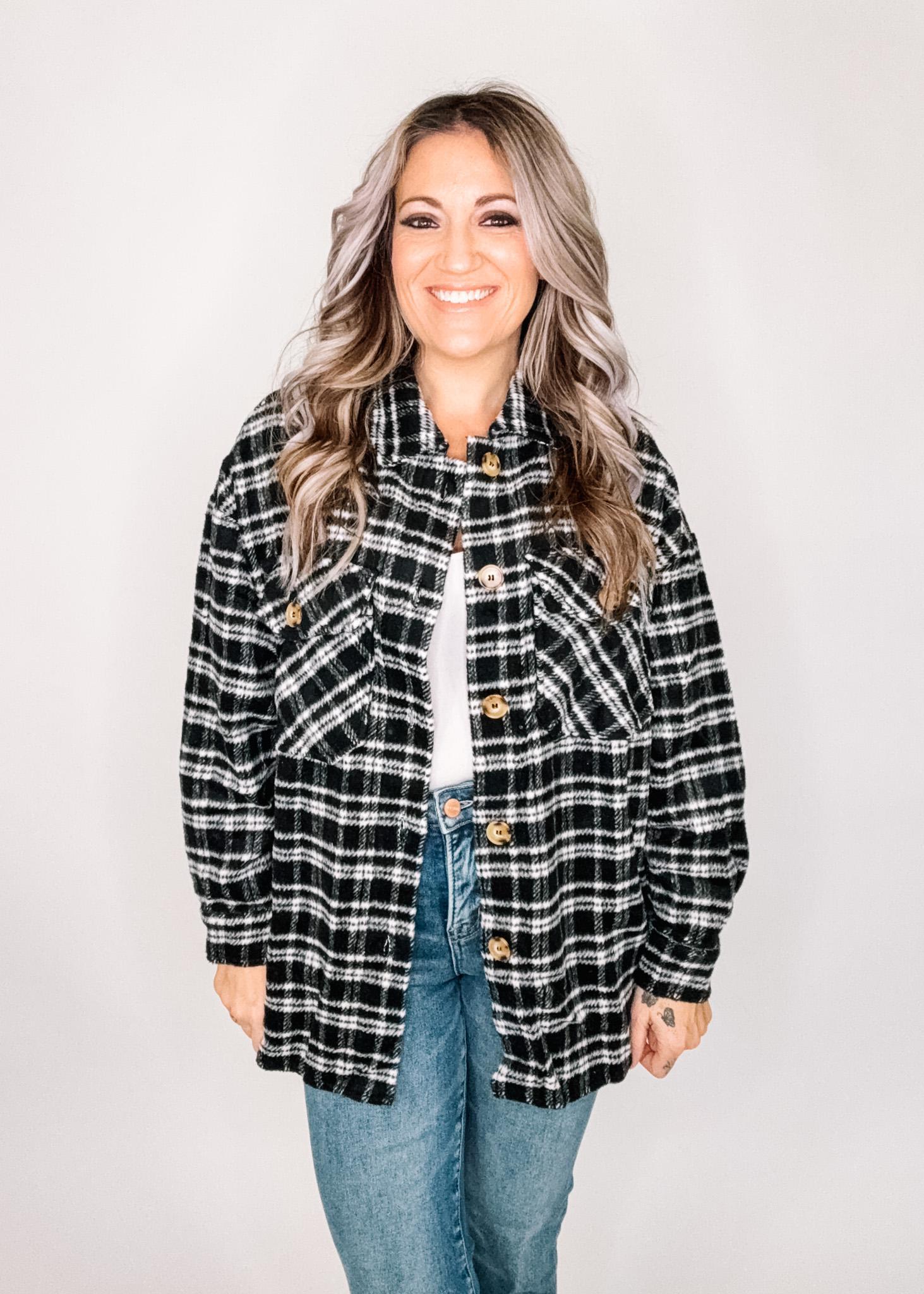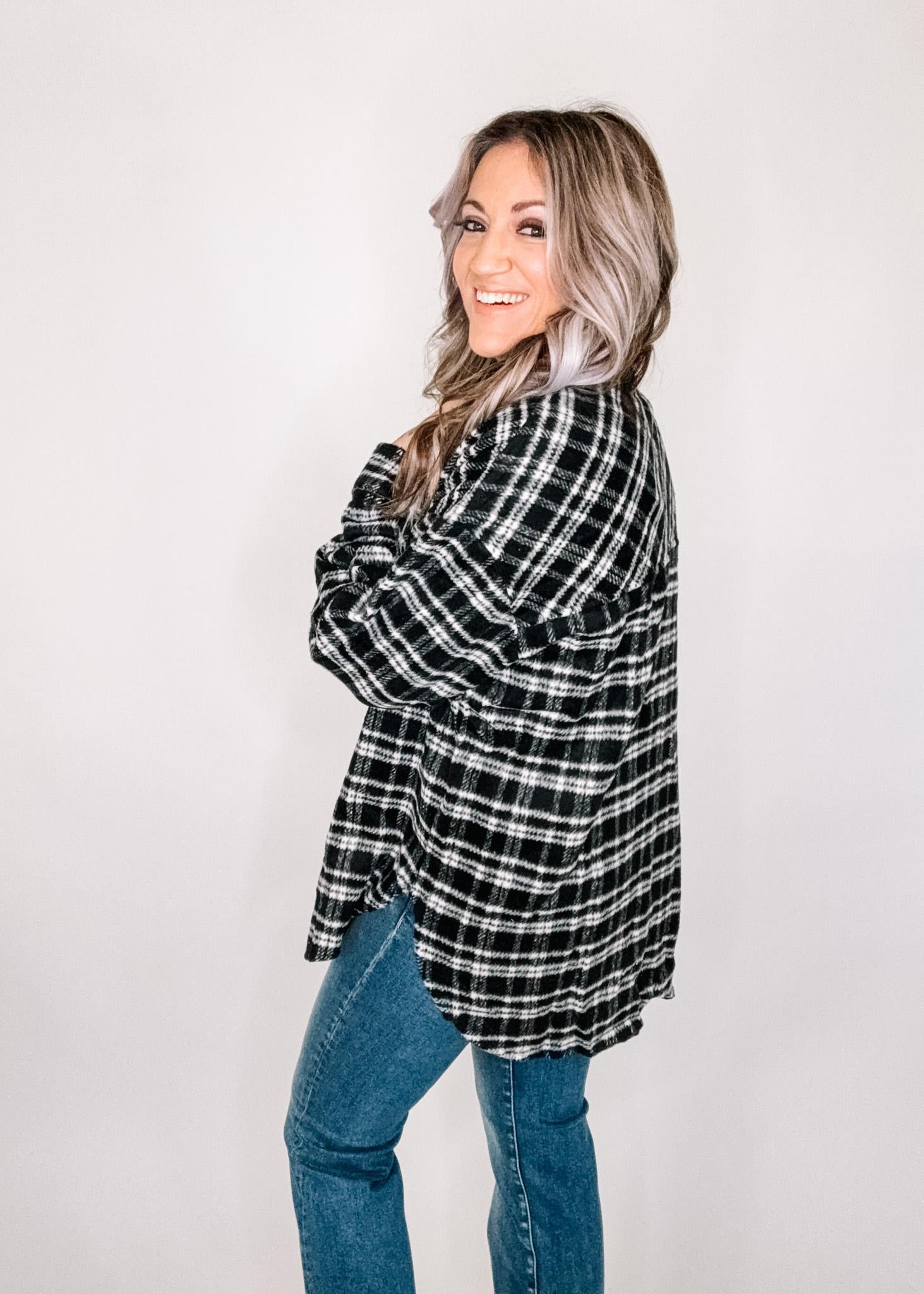 A black and white plaid shacket in the softest flannel, relaxed fit, and easy to layer. Make this top festive for the holidays, wear casually with leggings or jeans. This is a great classic look, easy to give as a gift too.