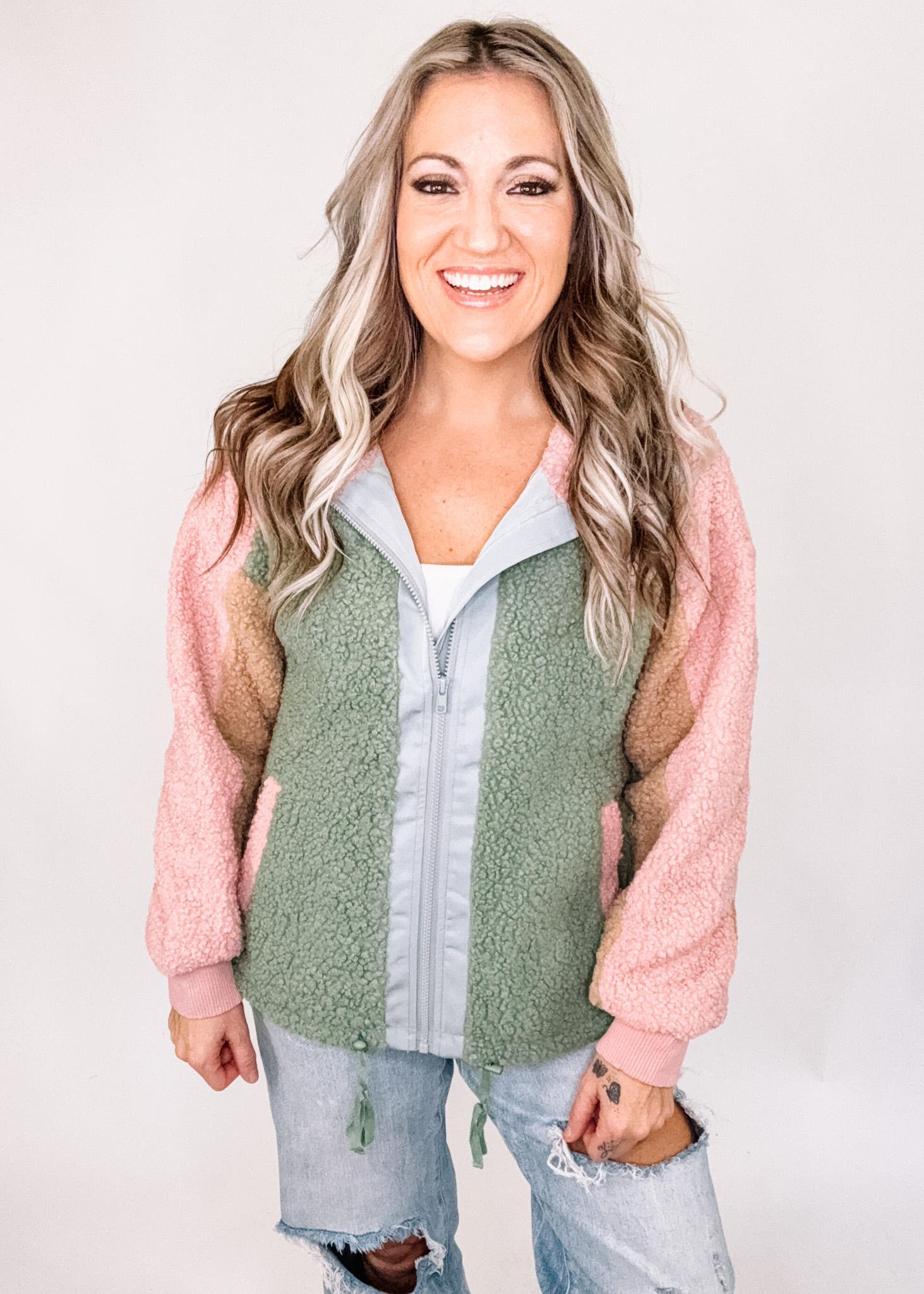 This is such a sweet little zip up, perfect for staying warm this winter and into the earl spring. The pastel color scheme is perfect for the new year and the soft sherpa material is great to stay warm through spring. Whether you're running errands, catching a flight, or hanging on the ball field this jacket does it all.