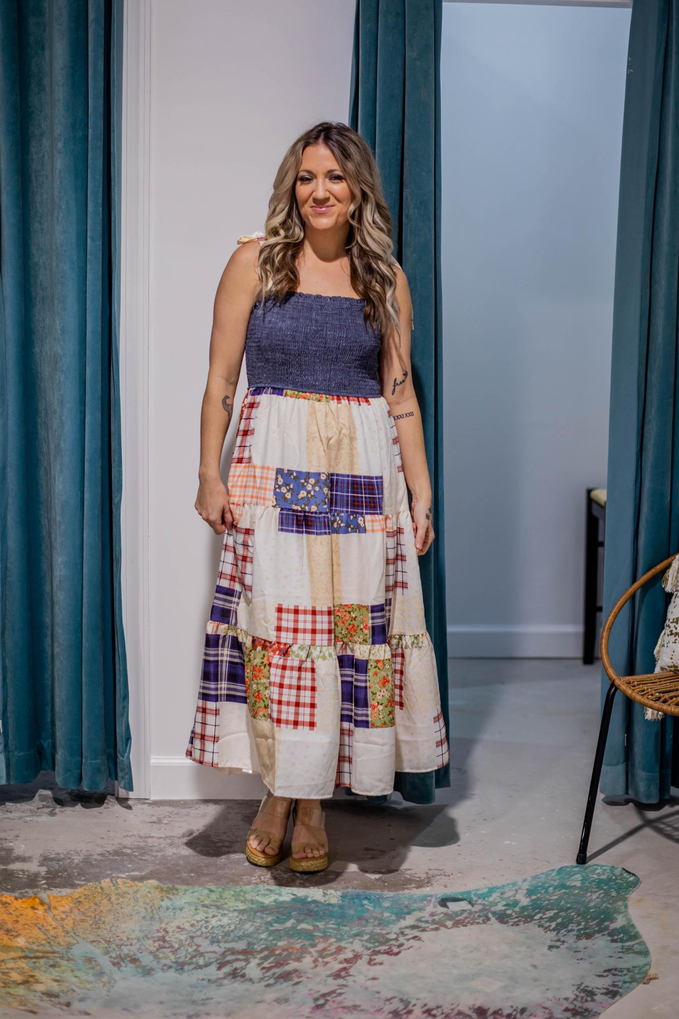 A cutie patch work maxi dress with denim smocked top detail, tie straps, and a funky patchwork maxi skirt. I love this dress for summer time fun.