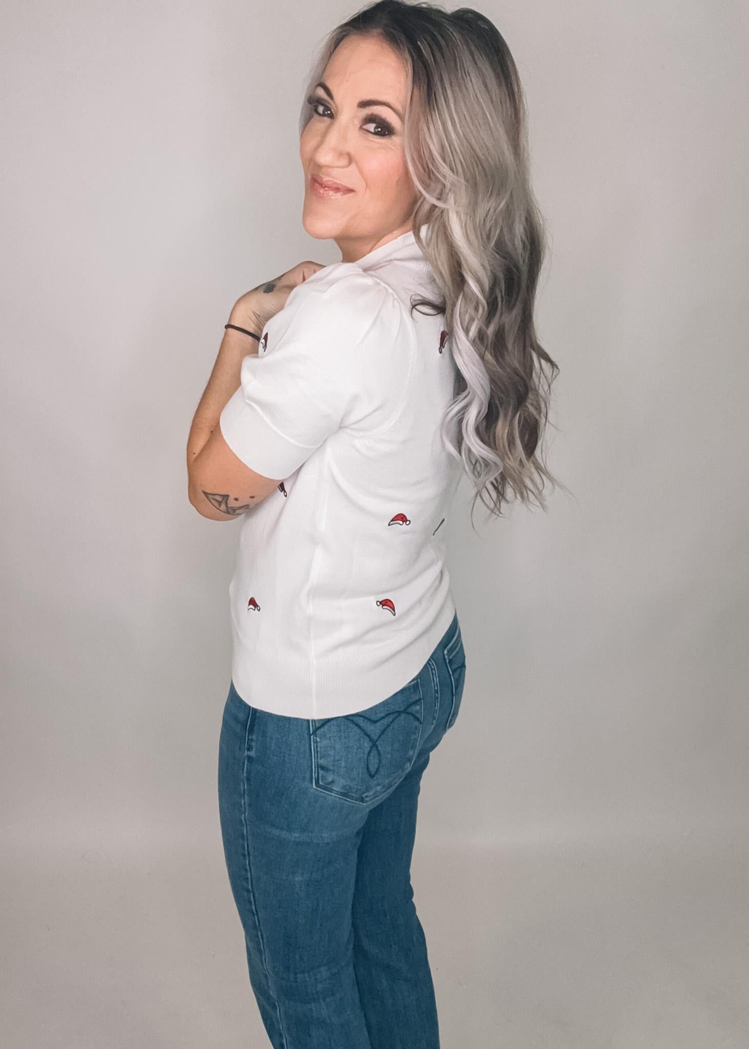 A classic mock neck white knit top with small embroidered Santa hats. This is such a cute knit top, easy to wear for work or weekend fun. Pair with denim or a cute mini skirt.