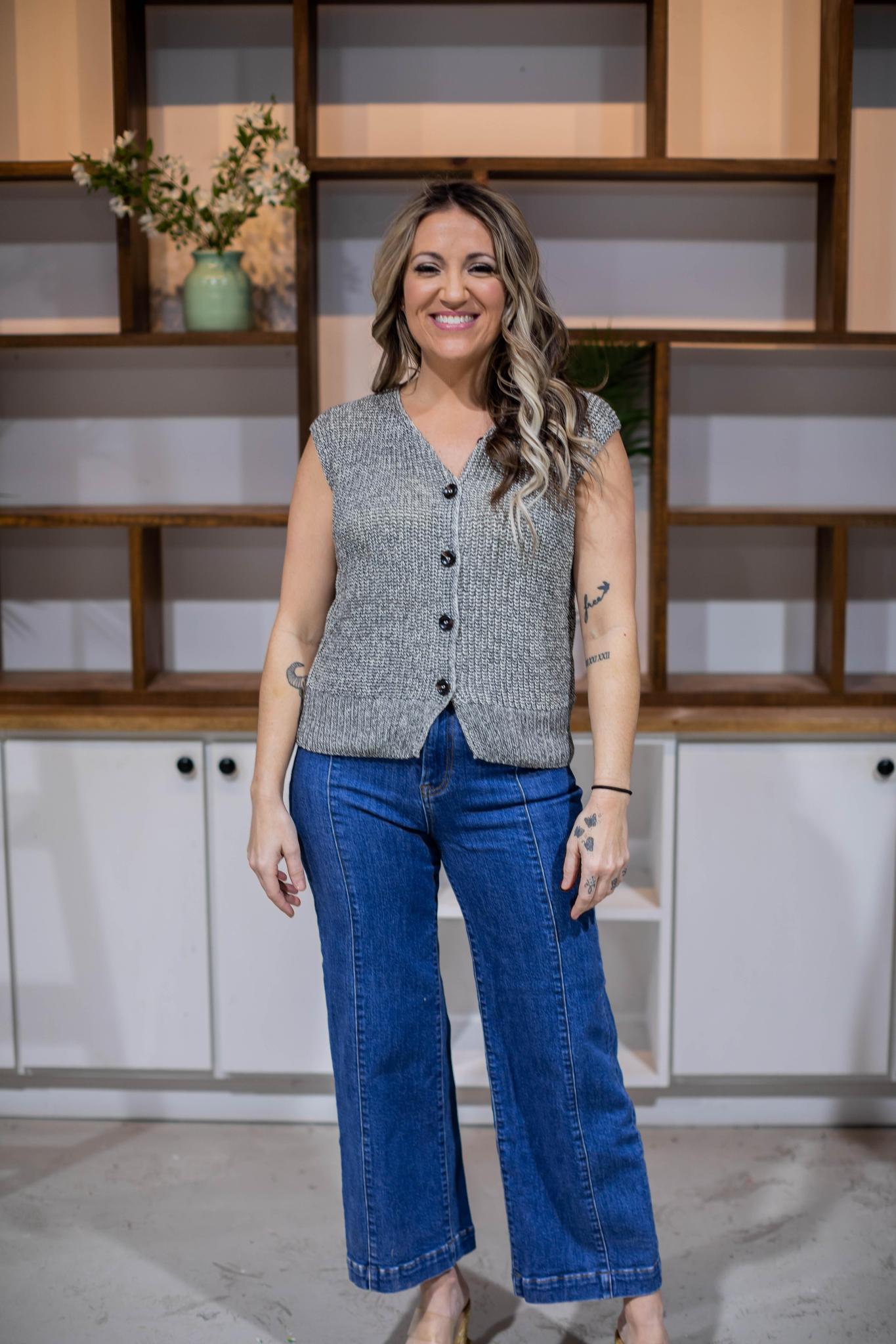 A trendy vest style top perfect for layering or wearing solo. A marbled style knit with blacks and ivorys, front button detail and a slight split bottom hem. This is a great work or weekend top, the perfect accent piece for a variety of looks.