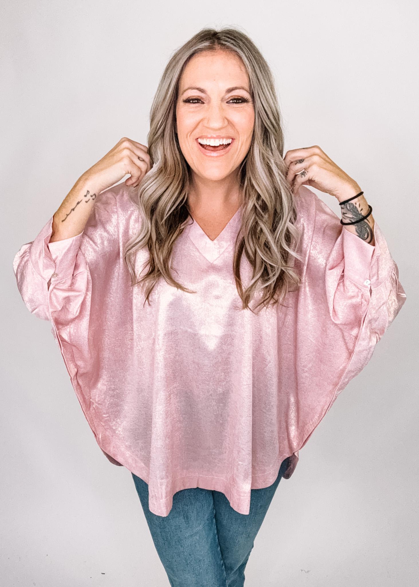 A v neck poncho style top, in a gorgeous shimmery fabric, with cuff sleeve detail, relaxed fit in the body and easy to wear for any festivity. A fun and festive silver or a sparkly pink. Pair with leggings, denim, or a cute skirt.