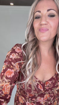 A gorgeous fall floral chiffon mini dress, with twist front detail, smocked back, with tie waist detail, and dainty chiffon material. Perfect for fall events.
