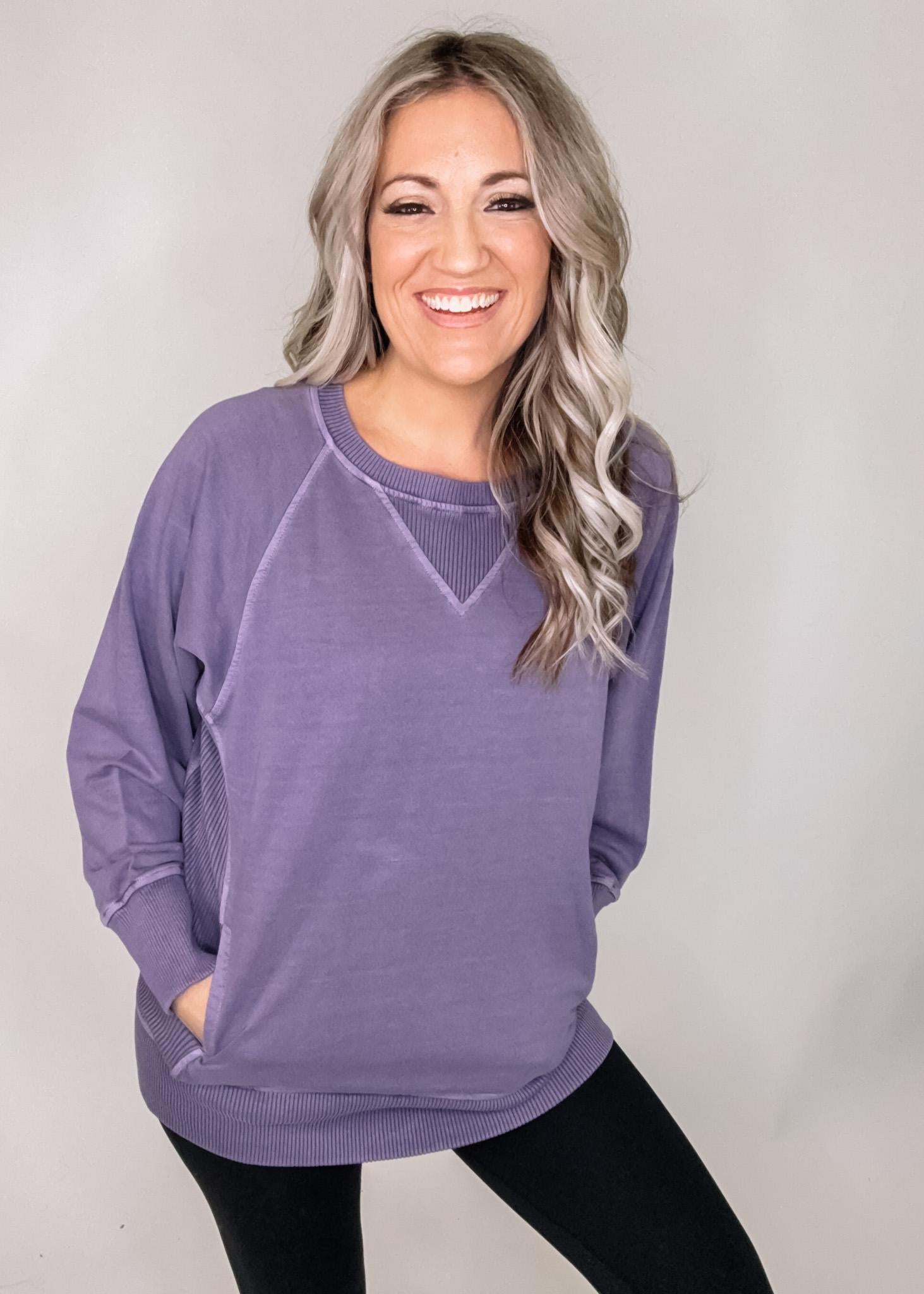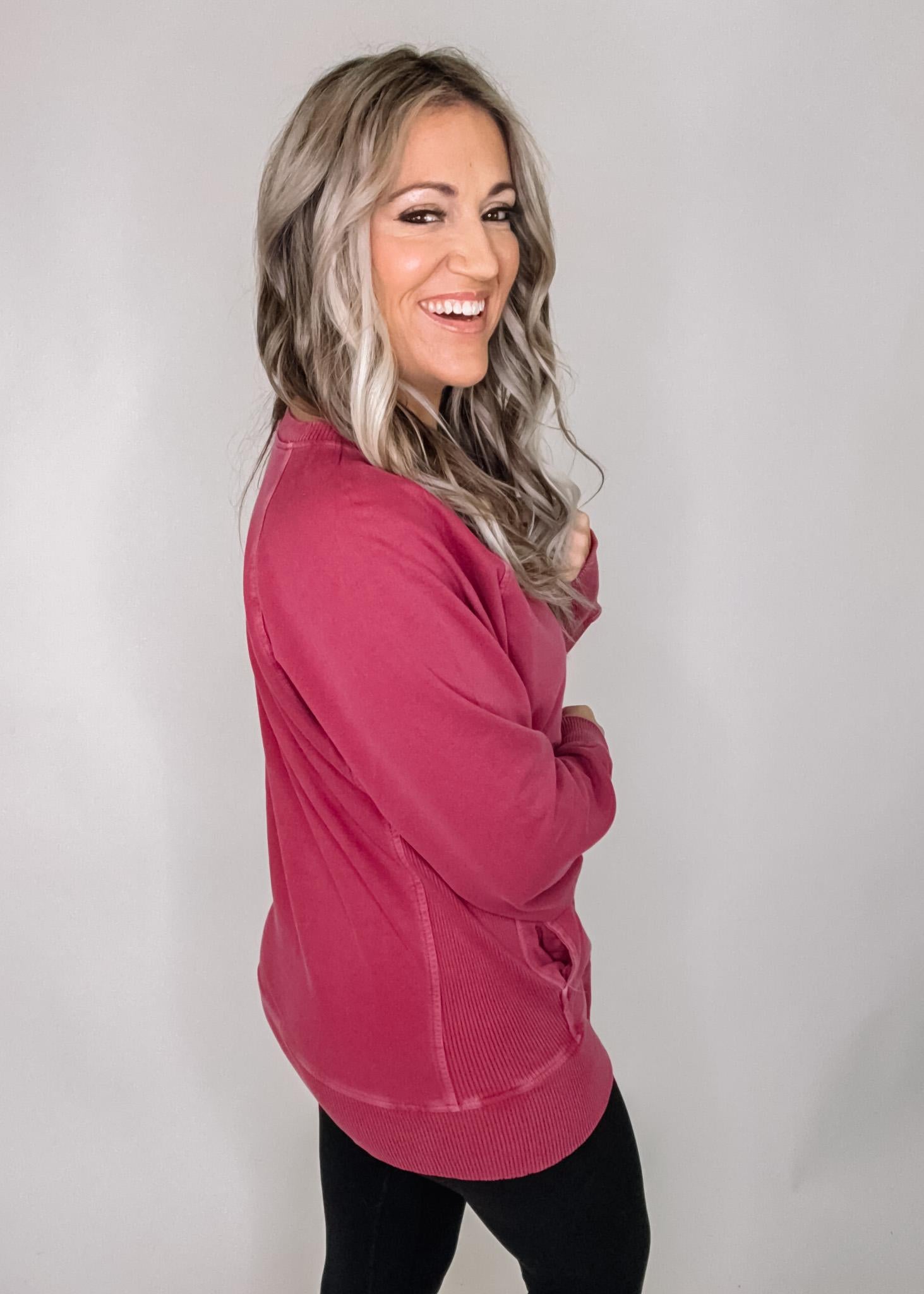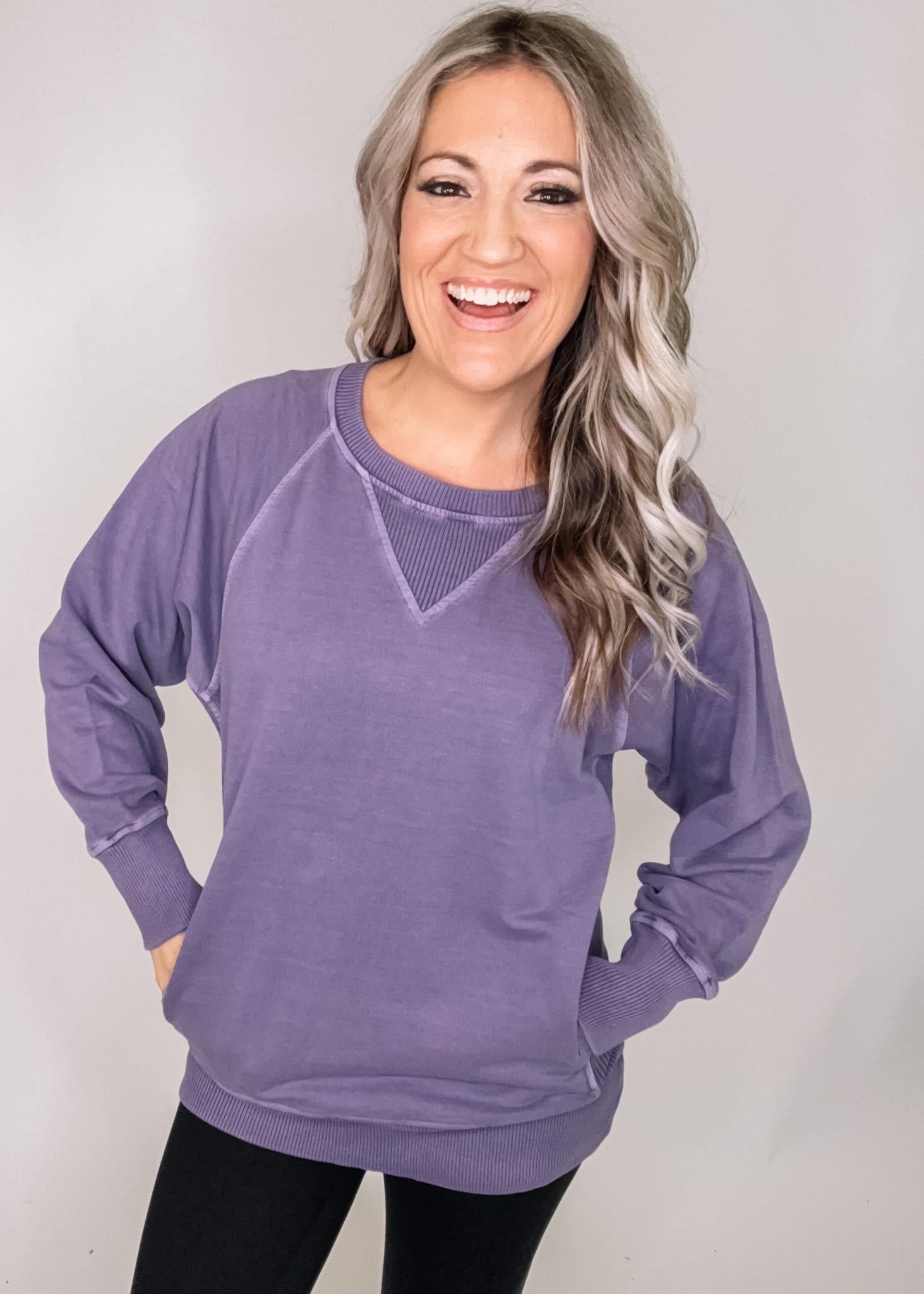 This is classic medium weight pullover with ribbed collar detail that has extra ribbed detailing in the front to match the cuff of the sleeve and the band around the bottom of the top. Generous in length, this top has side pockets, and a slightly vintage wash on the trim of the fabric. An easy throw in go for year round wear, this is classic, timeless, and will never go out of style.