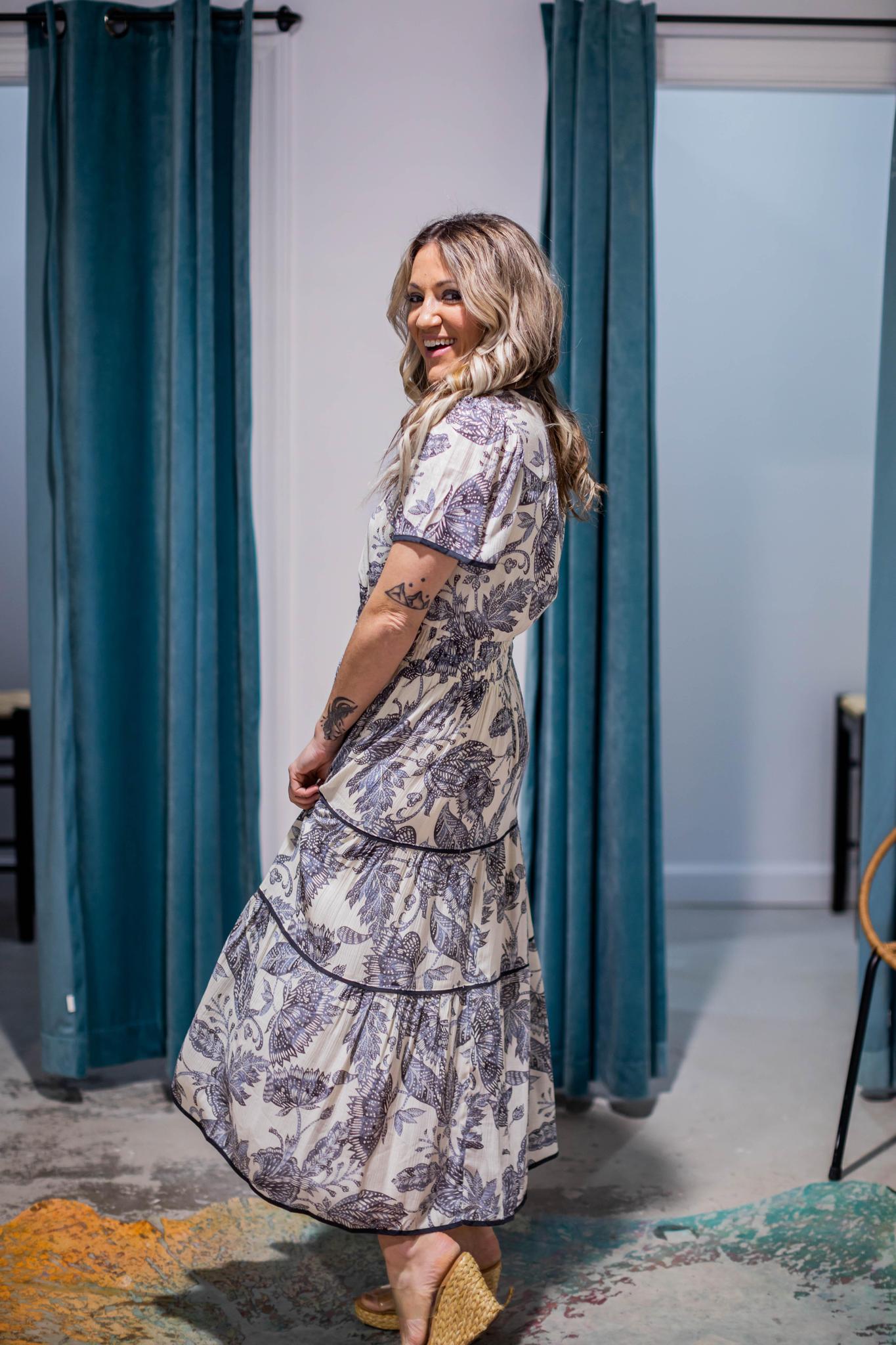 A printed tiered maxi, with charcoal grey trim, smocked waist detail, and a subtle tiered skirted body. This soft ivory and grey color scheme is perfect for spring, summer, and early fall. This is a wonderful option for work, weekend, vacation and more.