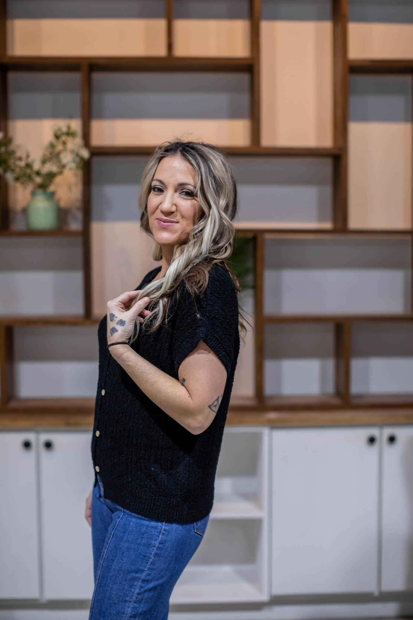 A classic textured knit sweater with split neck hem neck line and bottom hem. Front button detail, non functional, and a soft textured material. Classic black or ivory make for easy neutral year round styling.