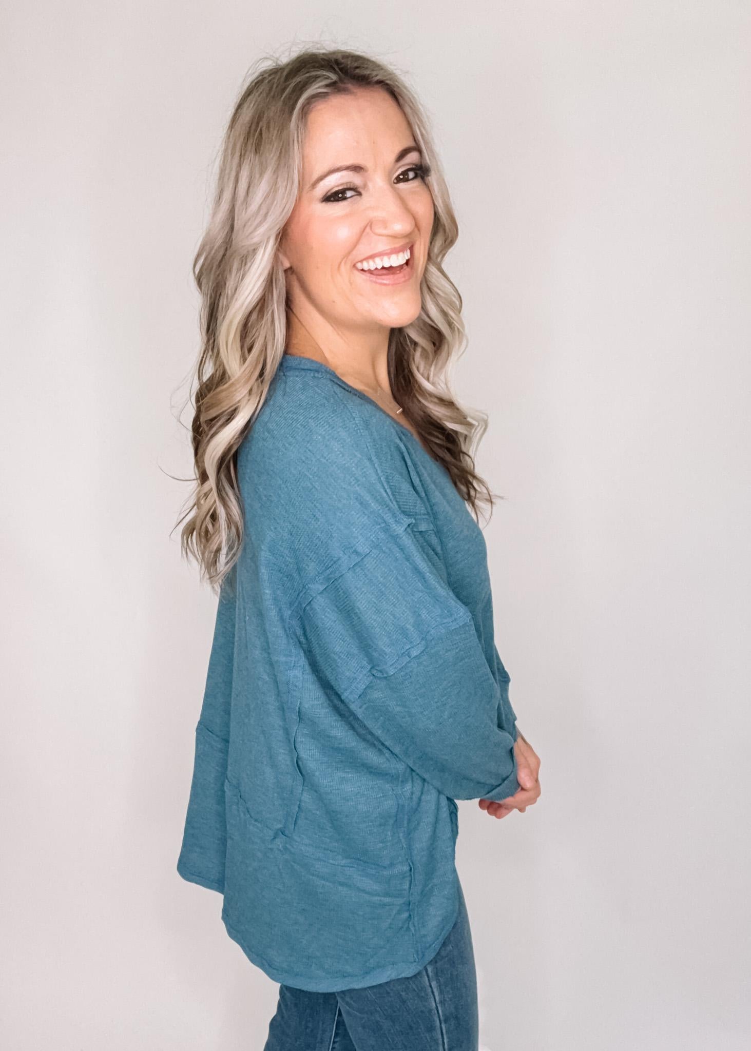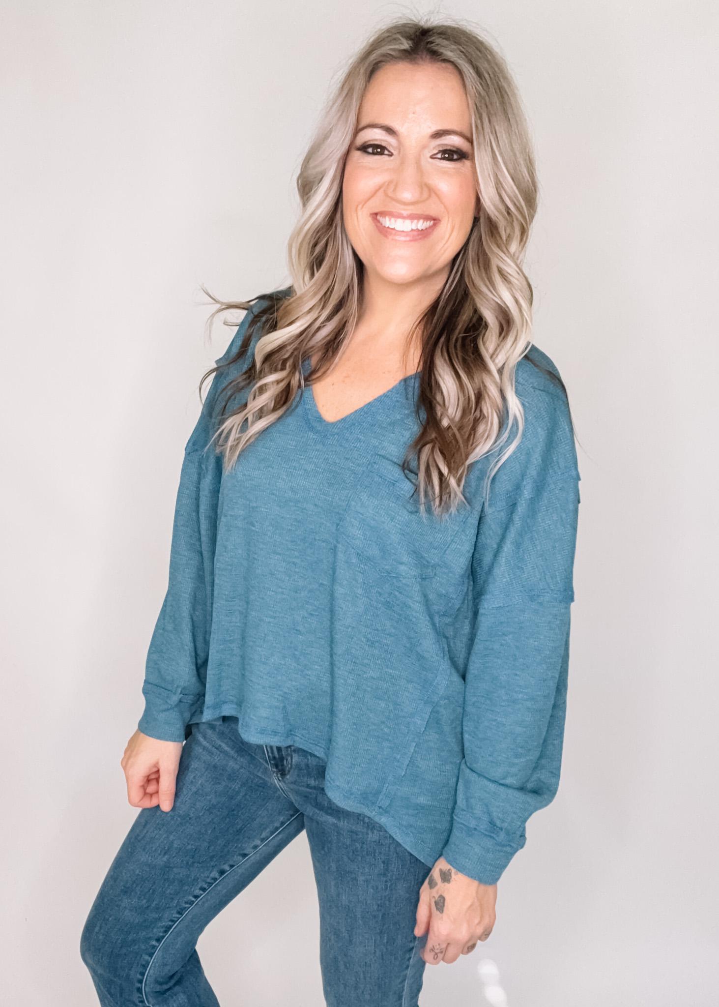 A classic waffle knit top perfect for casual wear. This blue is so classic, neutral for season to season, and easy to style. Relaxed fit but true to size.